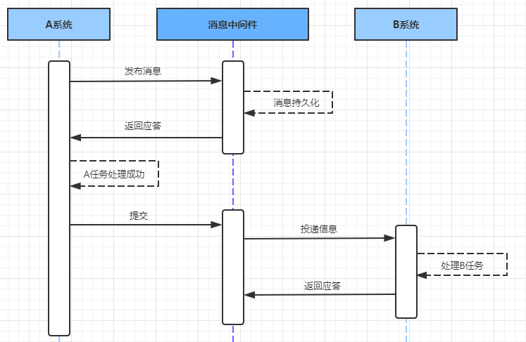- 在系统A处理任务A前,首先向消息中间件发送一条消息