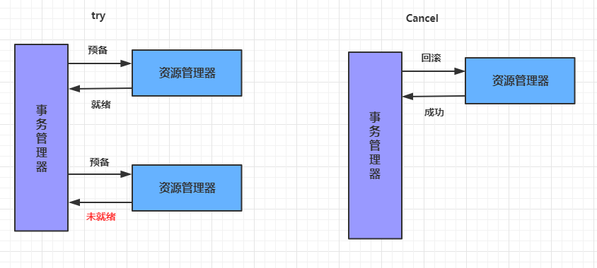 - Cancel: 取消待执行的业务:取消Try阶段预留的业务资源。通常情况下,采用TCC则认为Cancel阶段也是一定成功的。若Cancel阶段真的出错了,需引入重试机制或人工处理