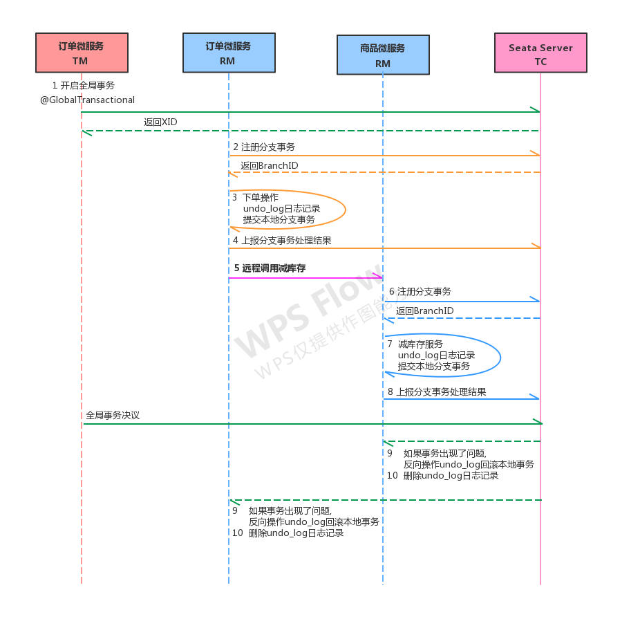 - 每个RM使用DataSourceProxy连接数据库,其目的是使用ConnectionProxy,使用数据源和数据连接代理的目的就是在第一阶段将undo_log和业务数据放在一个本地事务提交,这样就保存了只要有业务操作就一定有undo_log。