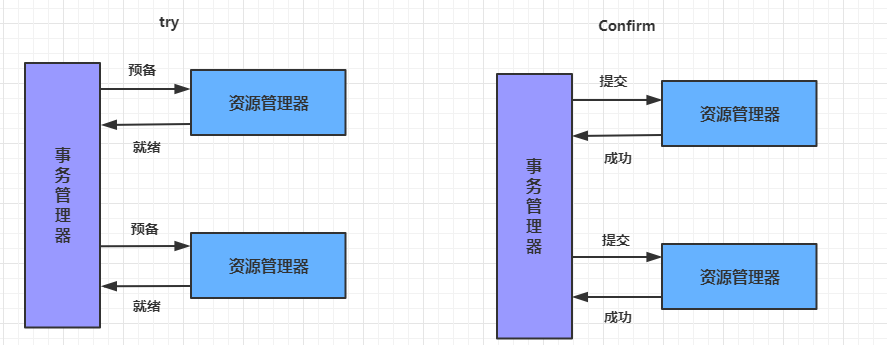 - Try: 尝试待执行的业务:这个过程并未执行业务,只是完成所有业务的一致性检查,并预留好执行所需的全部资源